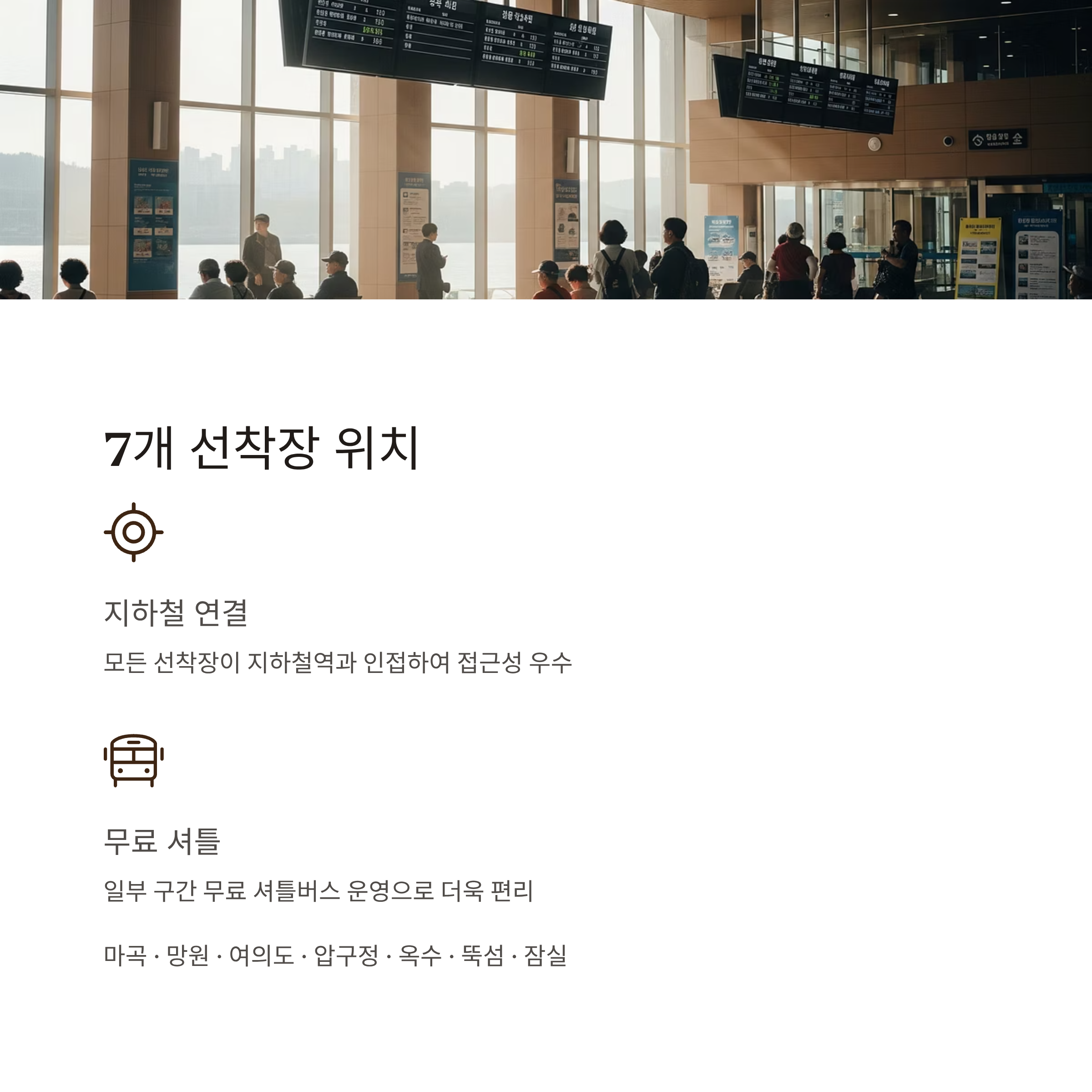 선착장은 마곡, 망원, 여의도, 압구정, 옥수, 뚝섬, 잠실 총 7곳에 마련되어 있습니다. 각 선착장은 지하철역과 인접해 있어 접근성이 뛰어나며, 일부 구간은 무료 셔틀버스가 운영되어 더욱 편리합니다.