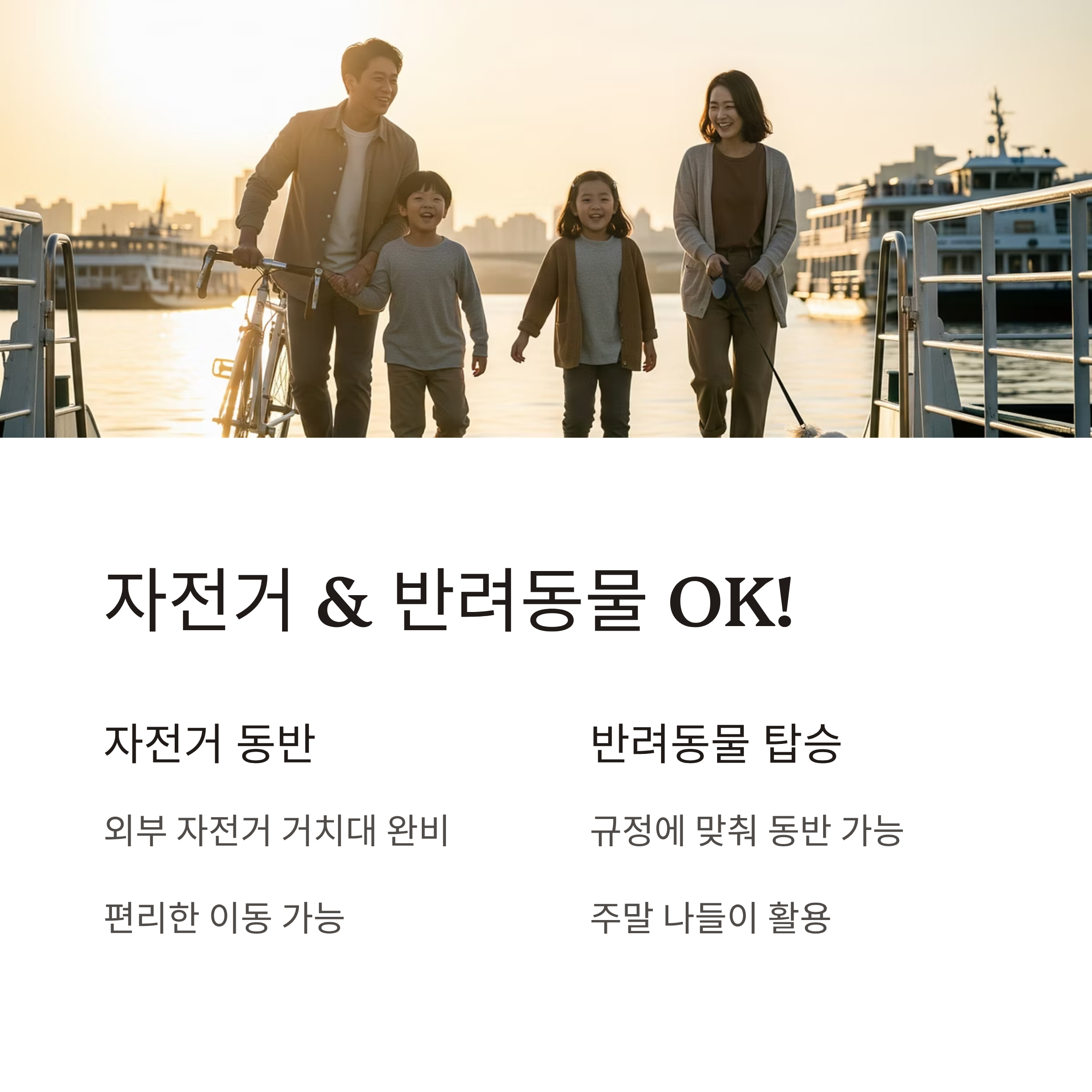 한강버스에는 외부 자전거 거치대가 있어 자전거 이용객도 편리하게 이동할 수 있습니다. 반려동물도 규정에 맞추어 동반 탑승이 가능해 주말 나들이에도 활용할 수 있습니다.
