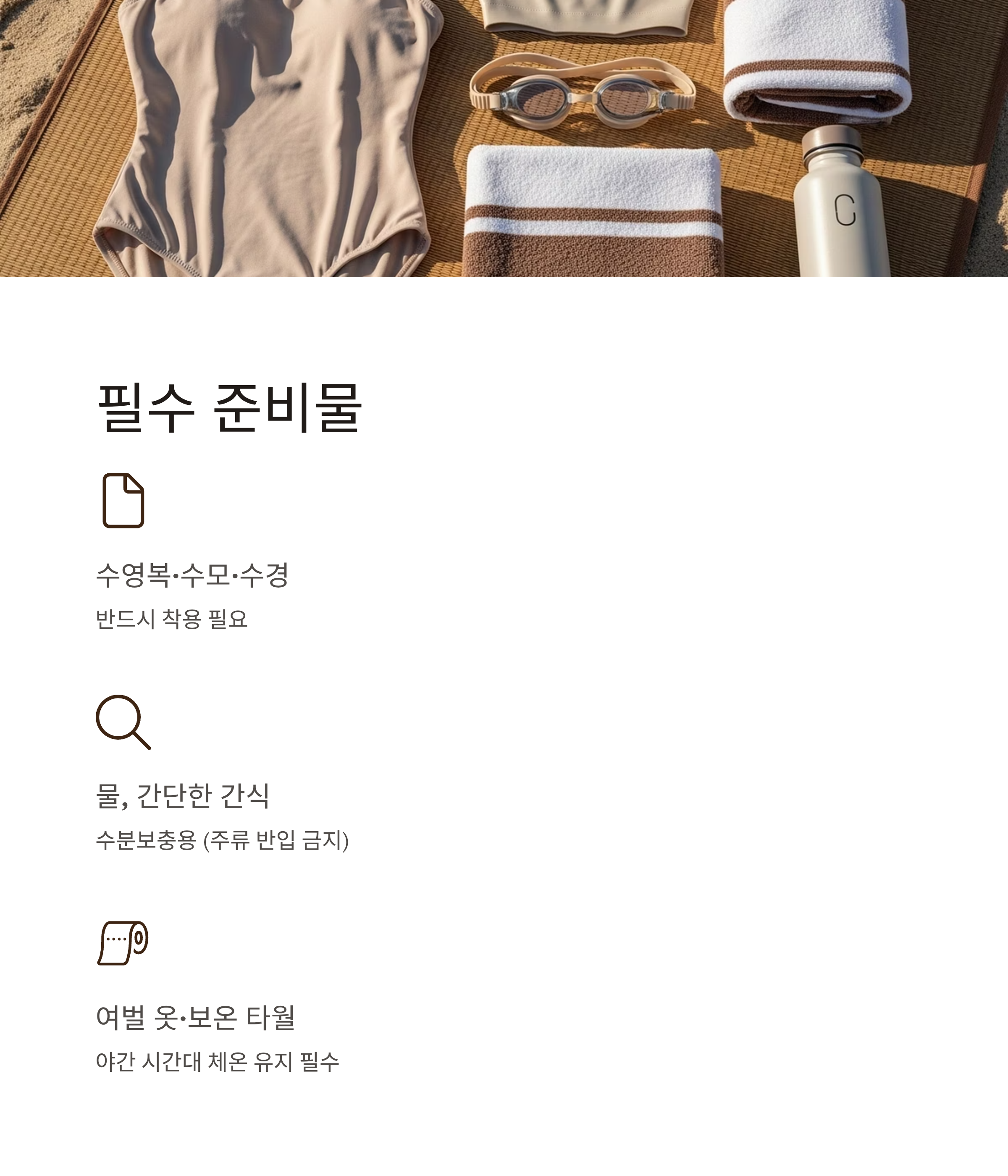 - 야간 이용 시 보온 타월, 여벌 의류 필수 지참