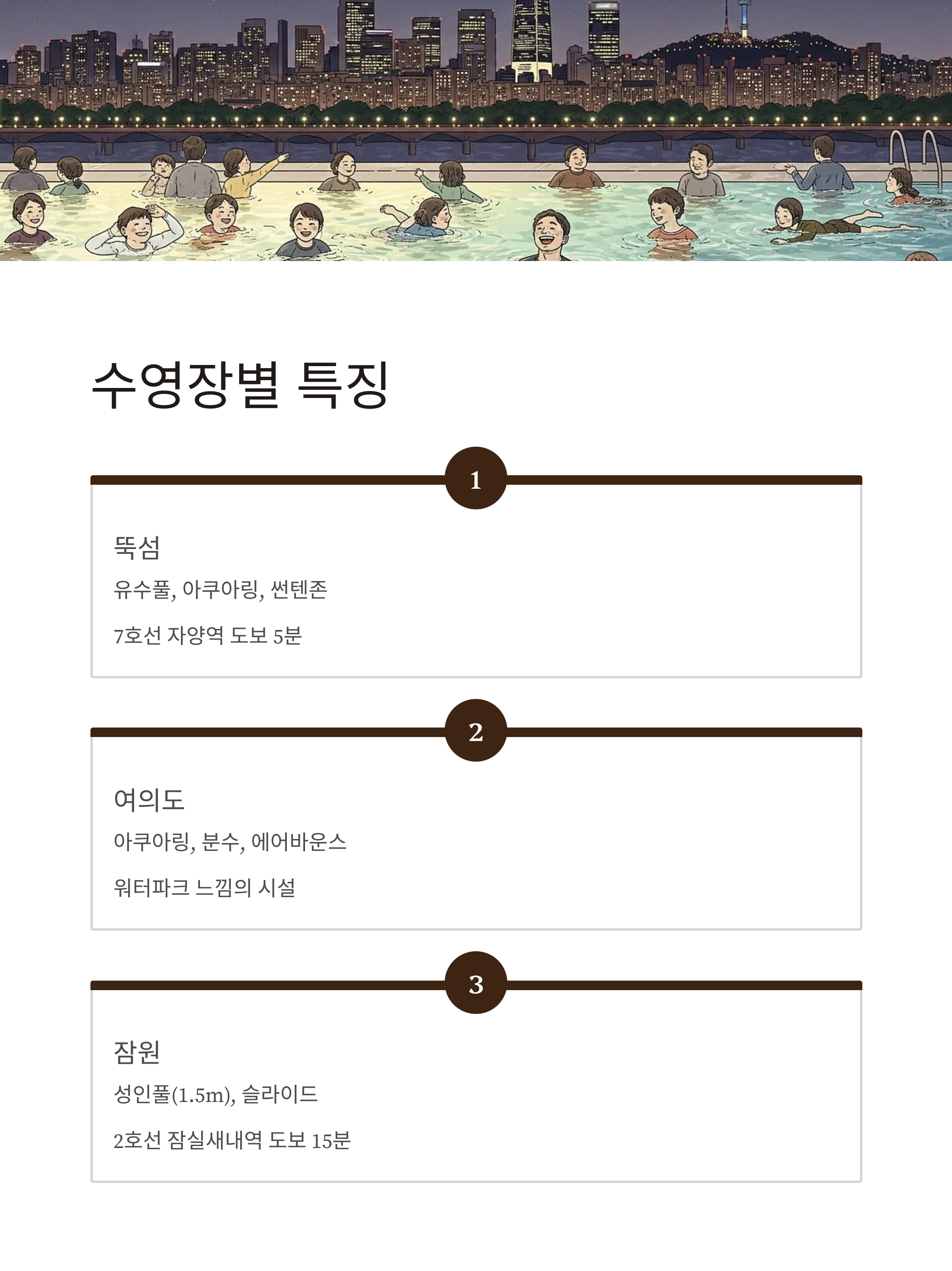 | 물놀이장 | 잠실, 난지, 양화 | 낮은 수심, 가족·어린이 중심 운영 |