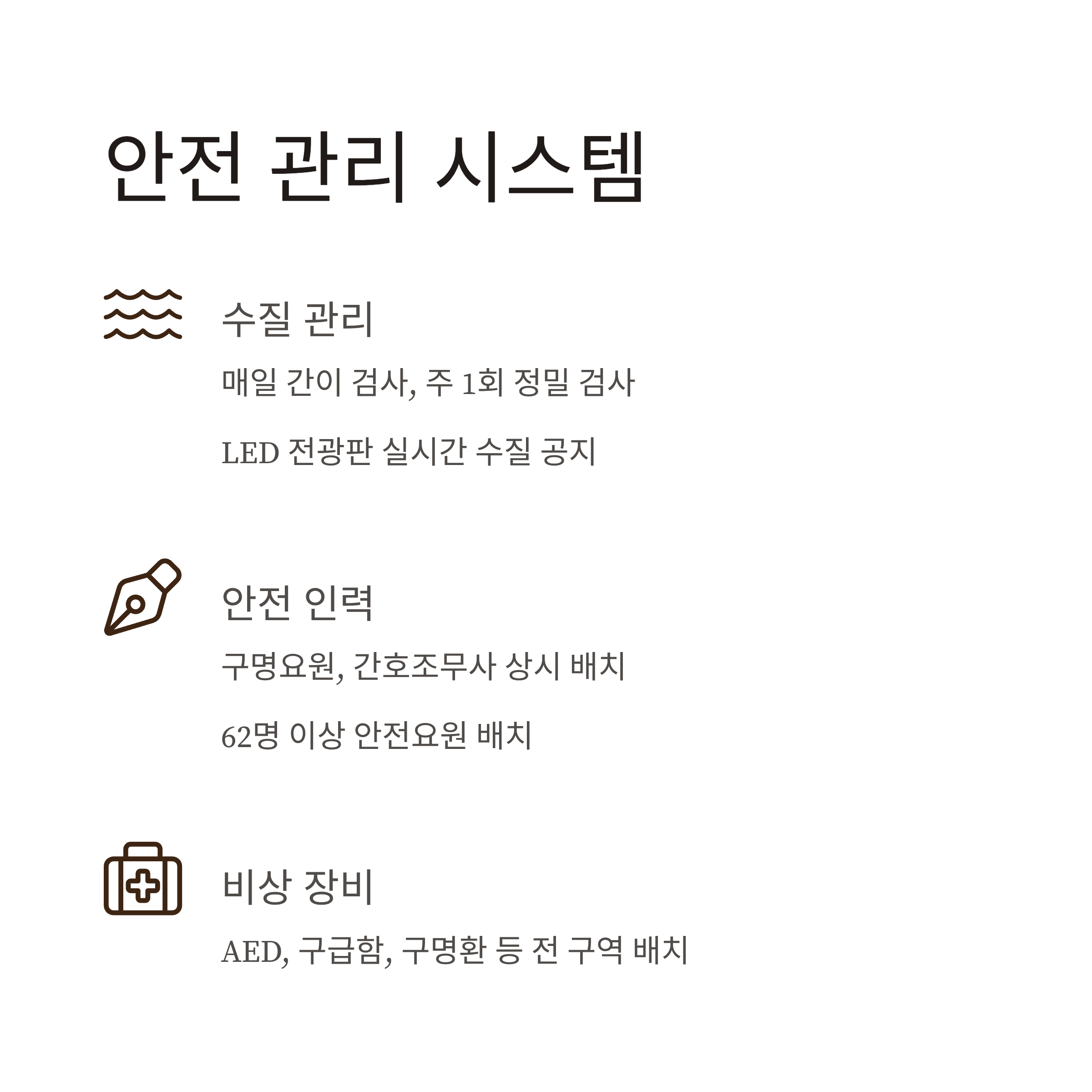 | 위생관리 | 수질 실시간 전광판 공지 + 정기 검사 실시 |