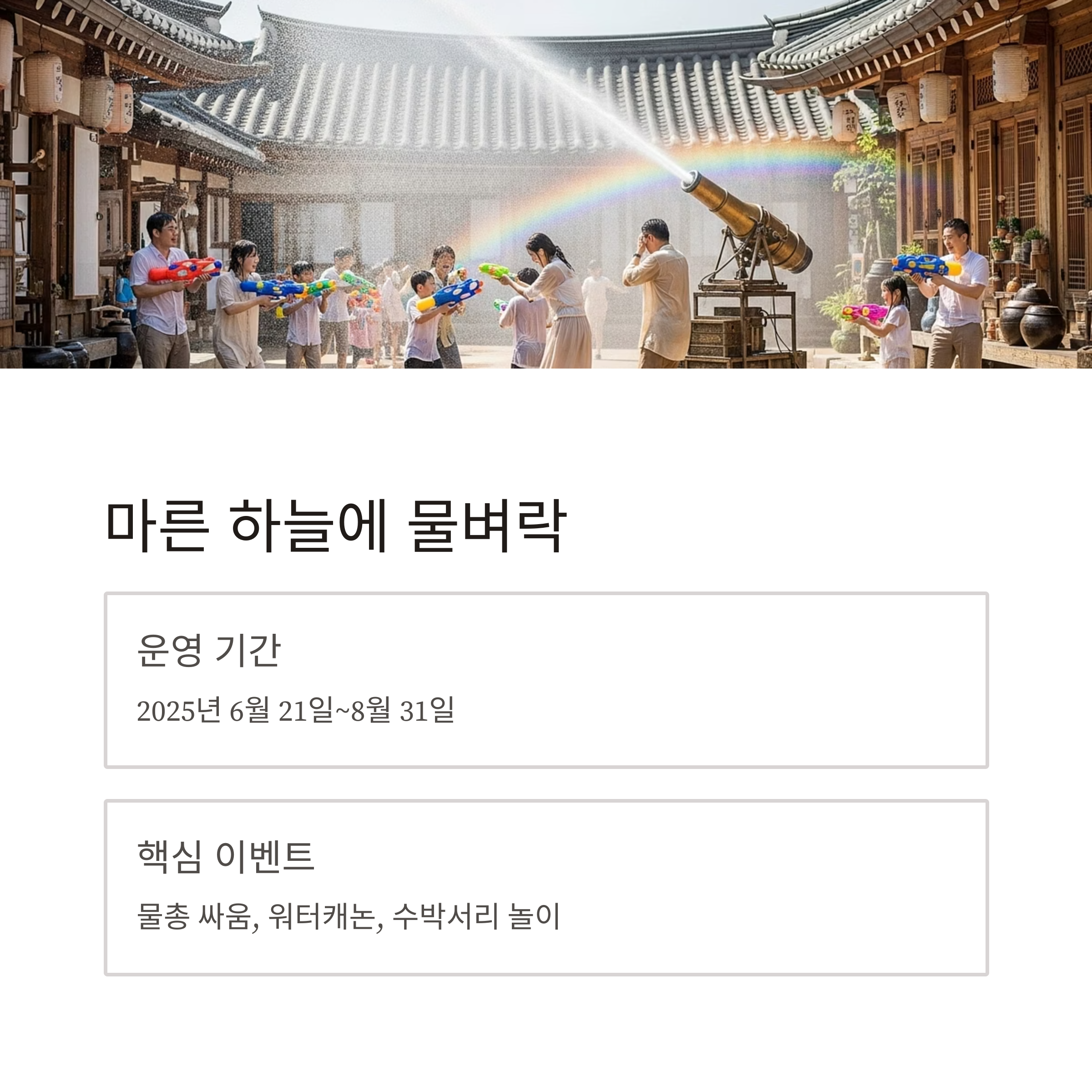 | 물벼락 축제 | 6/21~8/31 | 오후 3시 전후 | 입장료 포함, 할인 적용 가능 | 물싸움 + 워터 이벤트 |