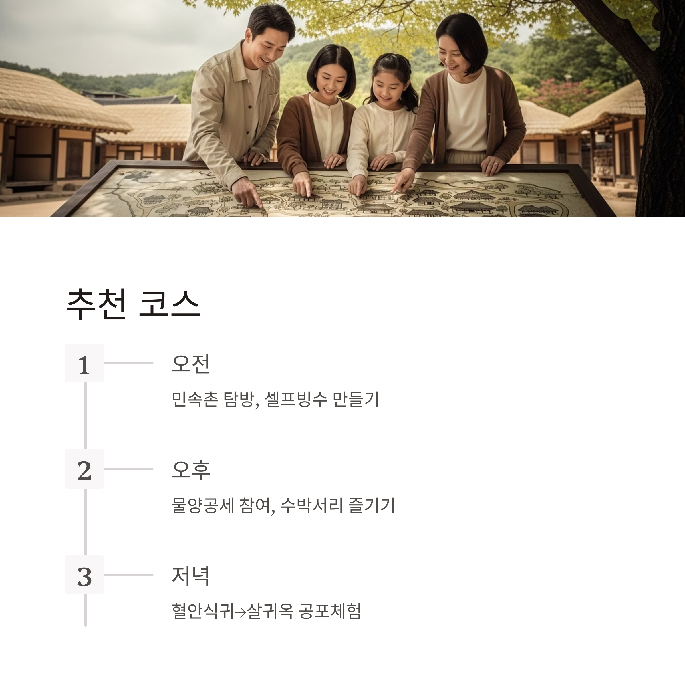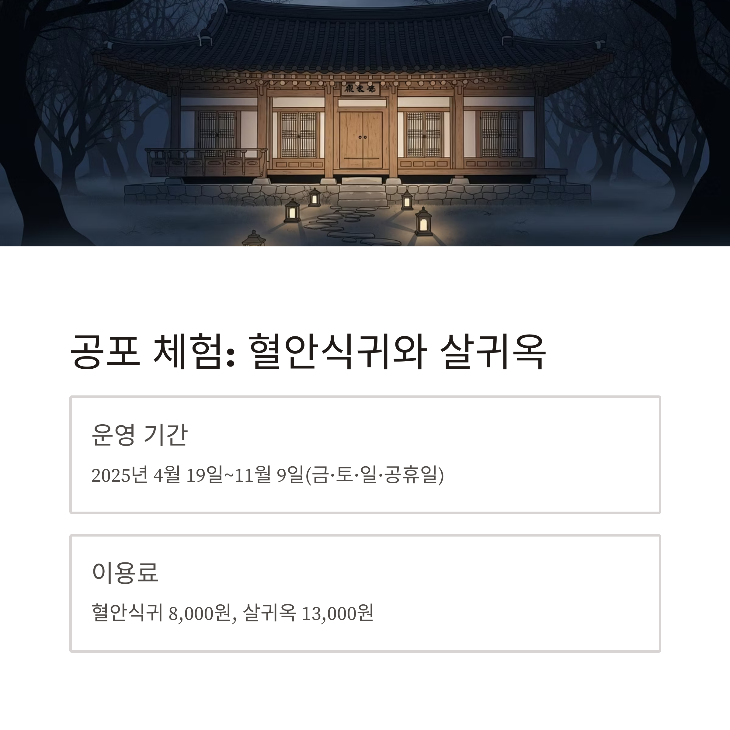 | 살귀옥 체험 | 4/19~11/9 | 해질 무렵~밤 | 13,000원 | 미로형 동선 + 음향 + 배우 연기 |