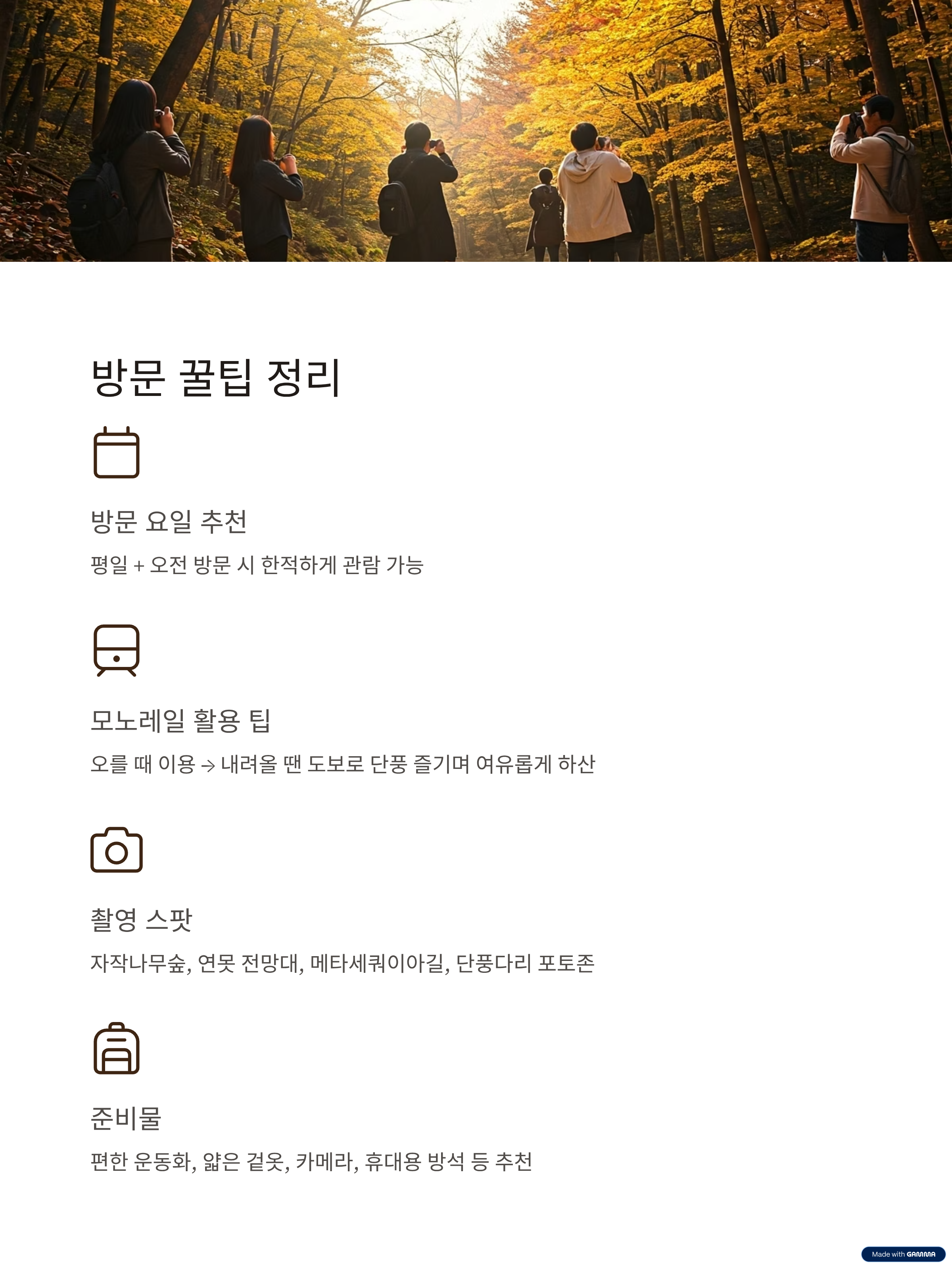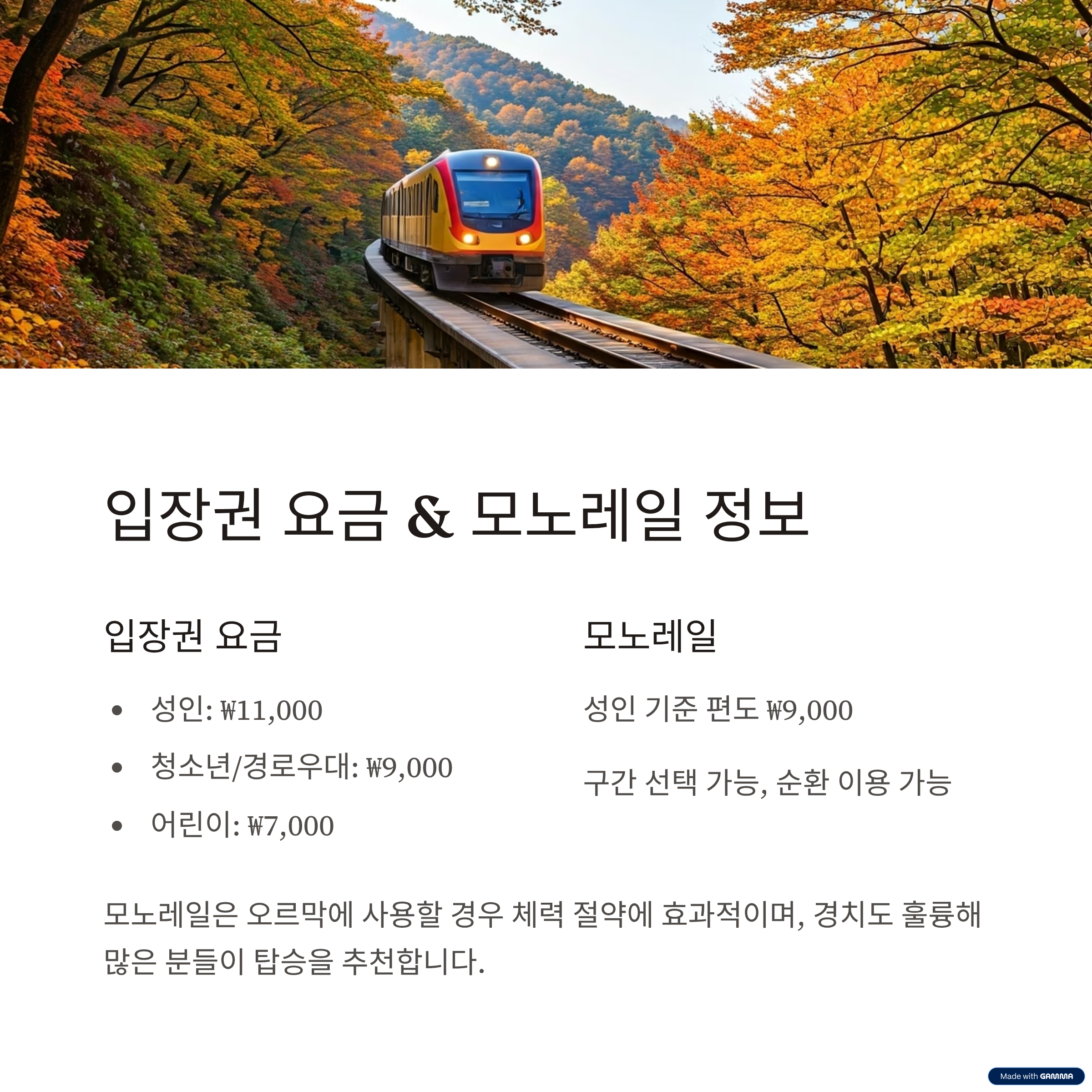 | 모노레일 활용 팁 | 오를 때 이용 → 내려올 땐 도보로 단풍 즐기며 여유롭게 하산 |