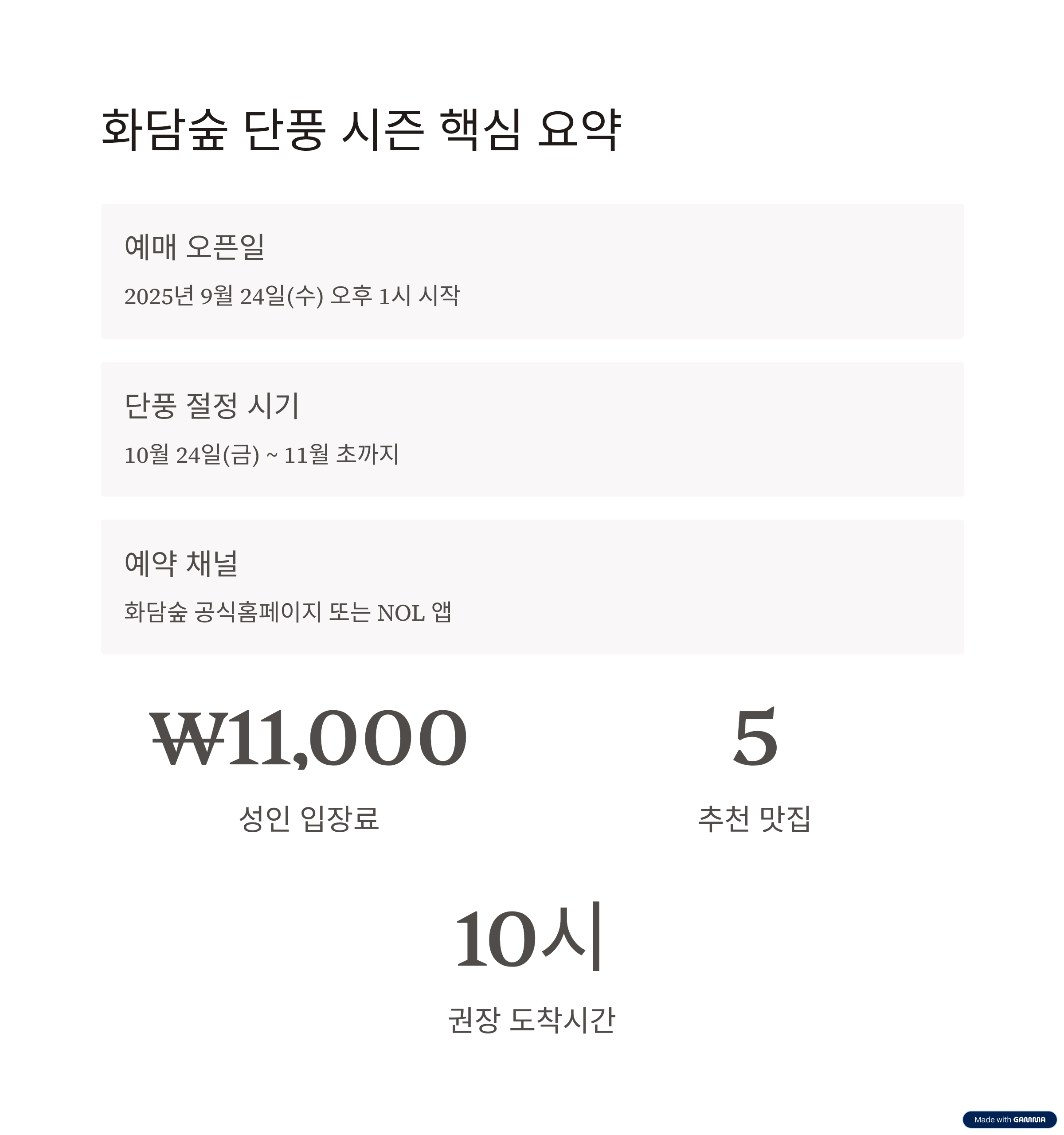| 단풍 성수기 기간 | 2025년 10월 24일(금) ~ 11월 16일(일) |