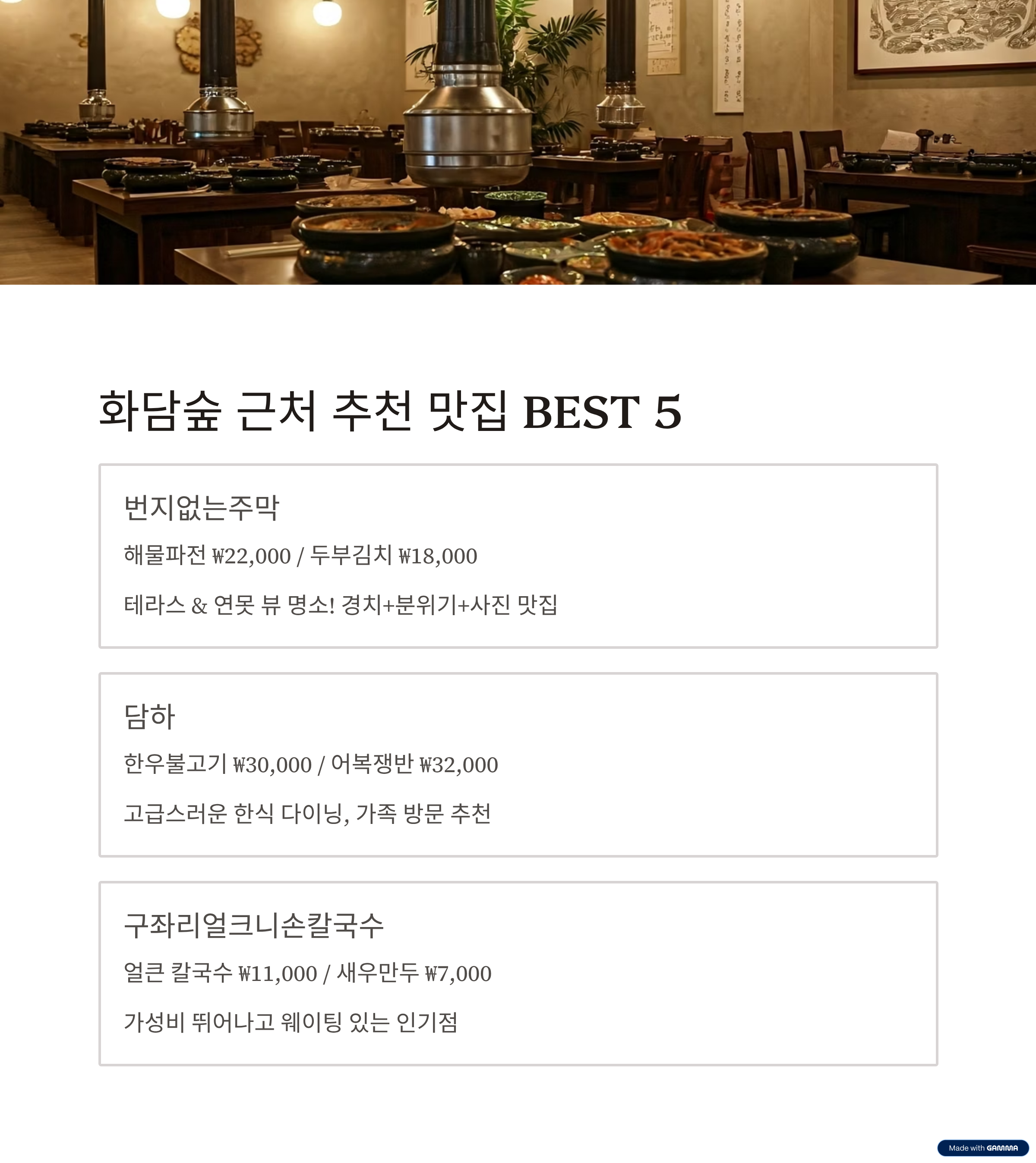 | 담하 (곤지암리조트 내) | 한우불고기 ₩30,000 / 어복쟁반 ₩32,000 / 보리새우전 ₩20,000 등 | 고급스러운 한식 다이닝. 가족 방문 or 연인과 식사 추천. 전반적 만족도 높음 |