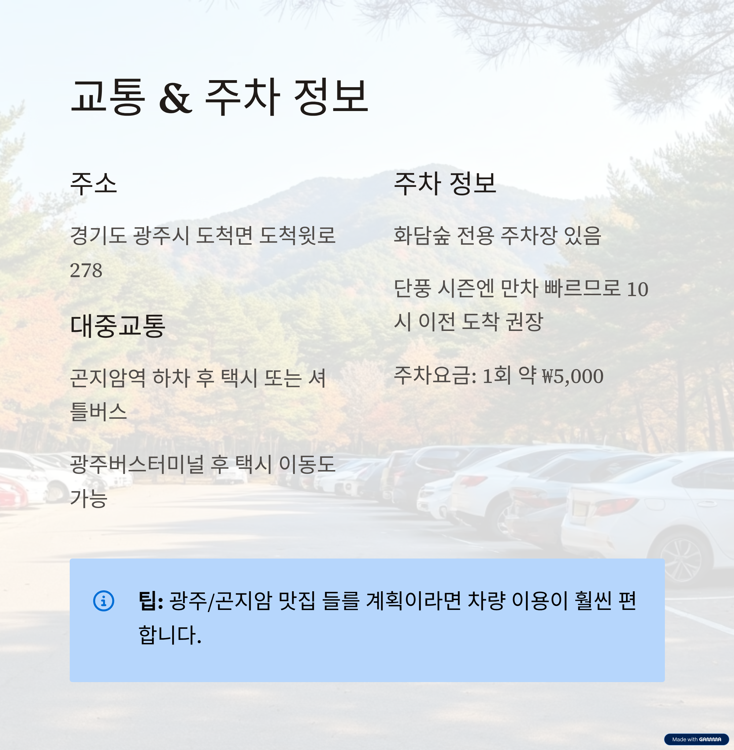 | 주차 | 화담숲 전용 주차장 있음. 단풍 시즌엔 만차 빠르므로 10시 이전 도착 권장 |