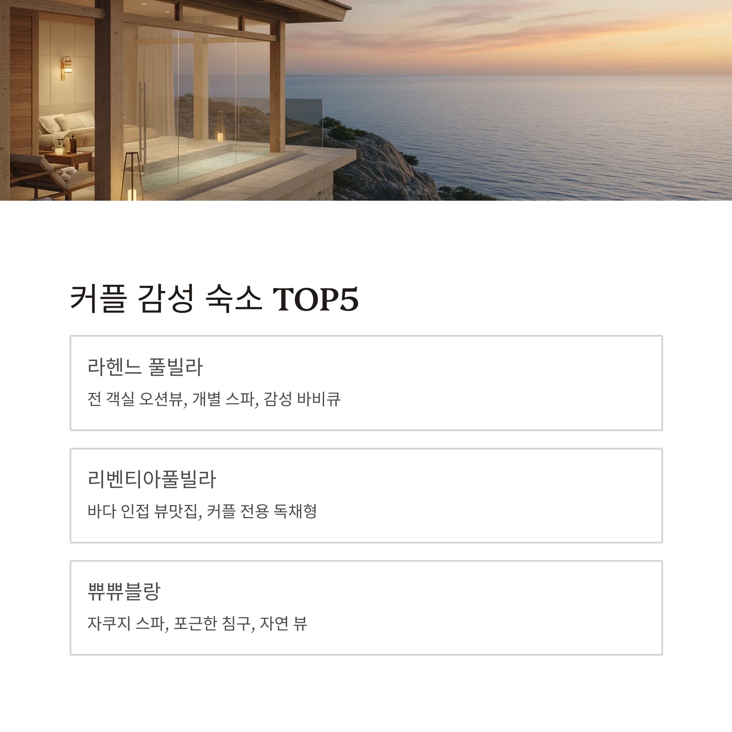 바다 전망, 프라이빗 스파, 감성 인테리어까지 커플 취향 저격 숙소만 골랐습니다.