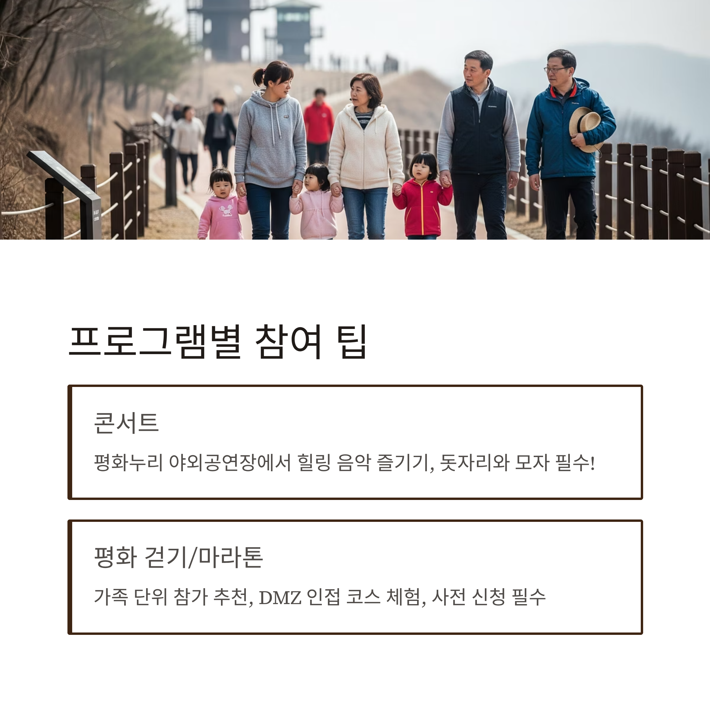 | 평화 걷기/마라톤 | 가족 단위 참가 추천, 실제 DMZ 인접 코스에서 걷기 체험 | 사전 신청 필수, 운동화 착용 등 기본 준비 필요 |