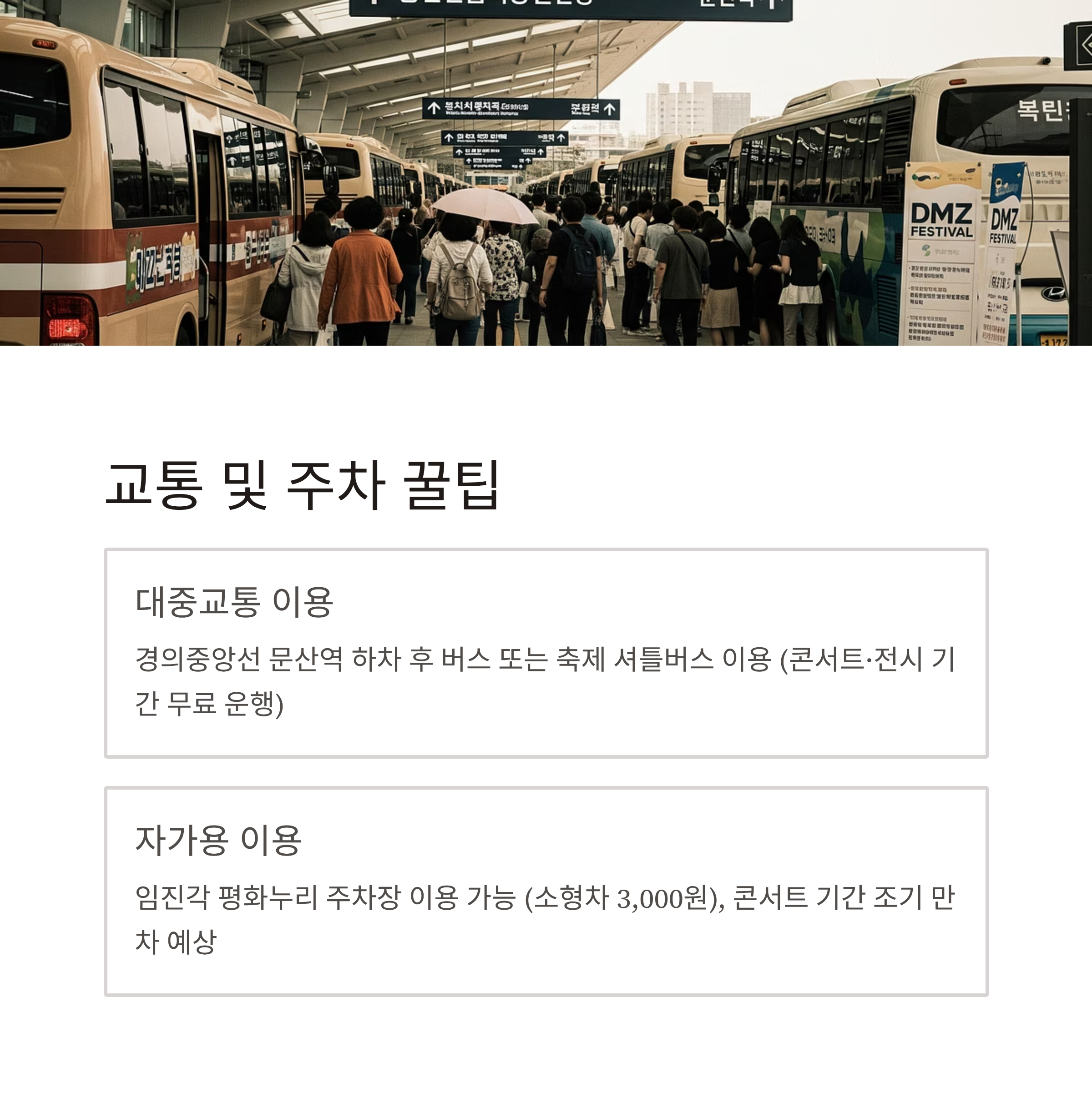 - 셔틀버스 운영 예정: 콘서트·전시 기간 중심으로 무료 운행