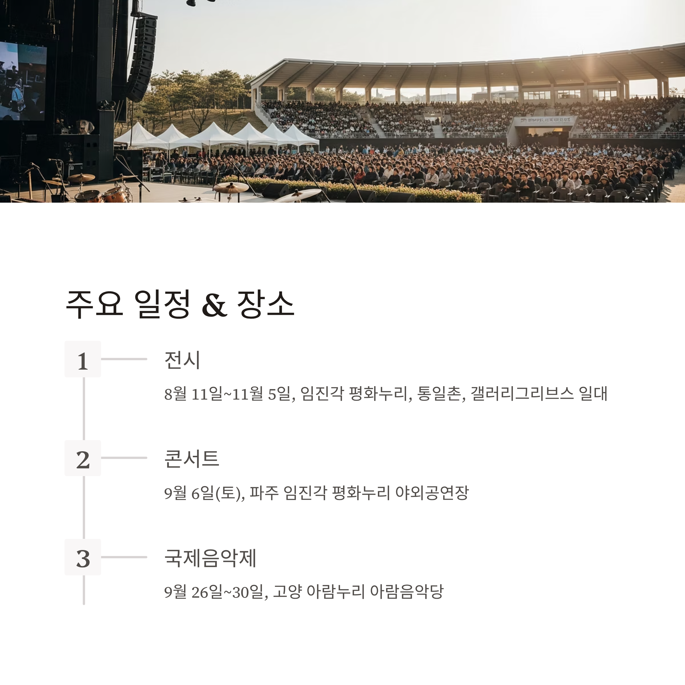 | 콘서트 | 9월 6일(토) | 파주 임진각 평화누리 야외공연장 |