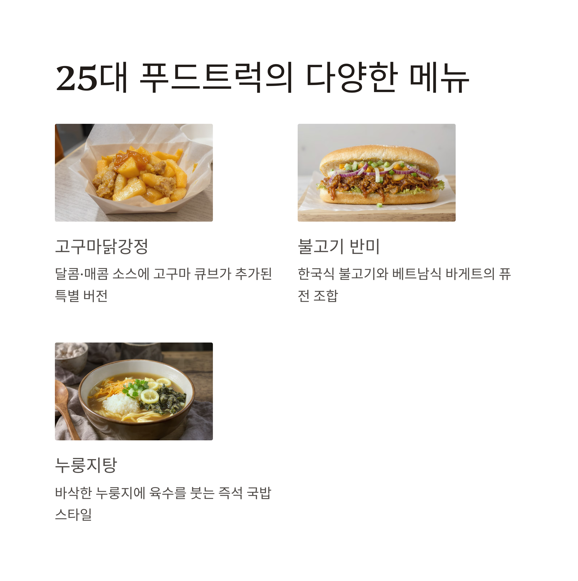 한국 전통 먹거리부터 창의적인 퓨전 요리까지 다양한 메뉴를 한 자리에서 즐길 수 있게 되었죠.